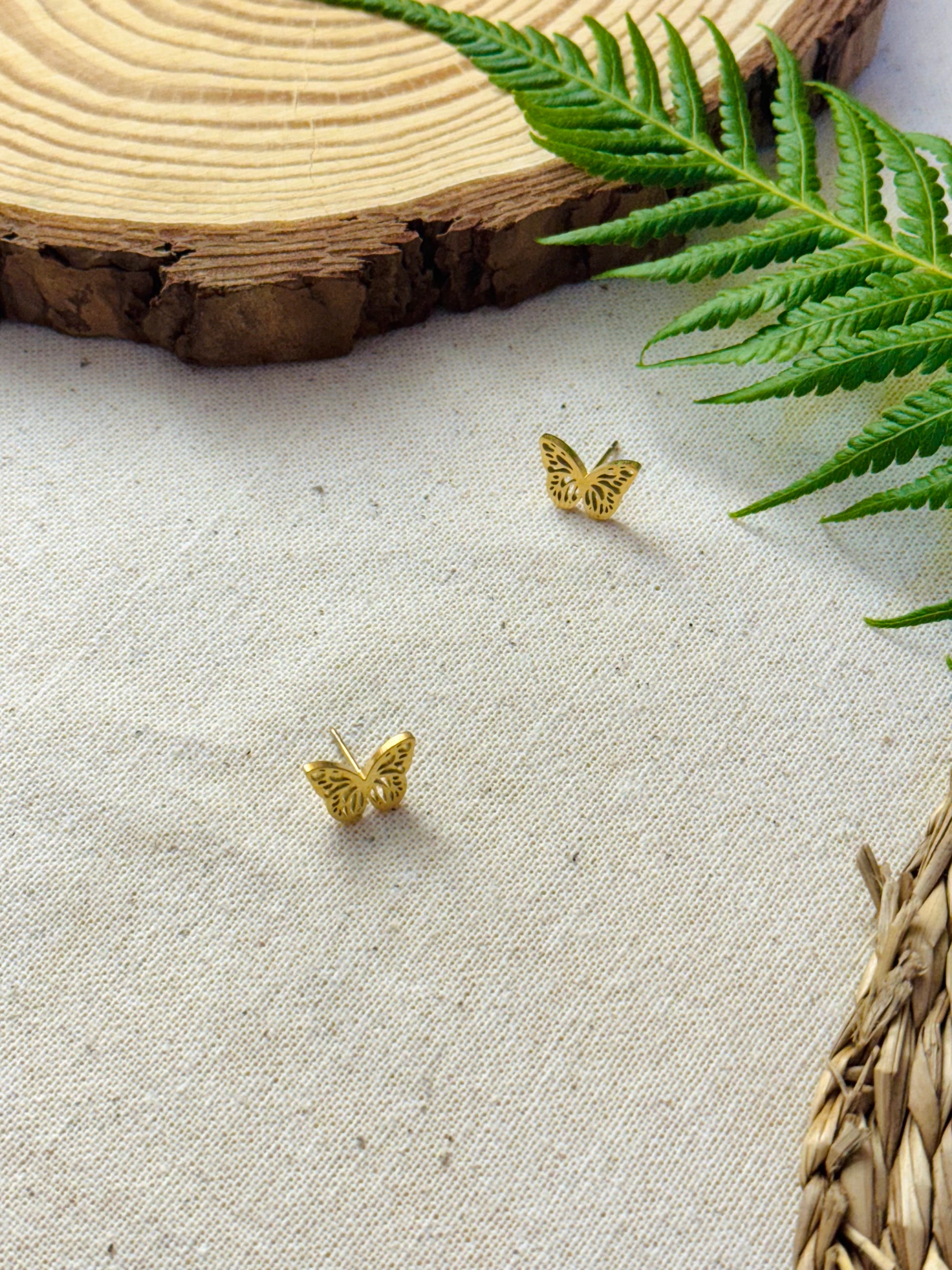 Boucles d’oreilles clou dorées avec un petit papillon.