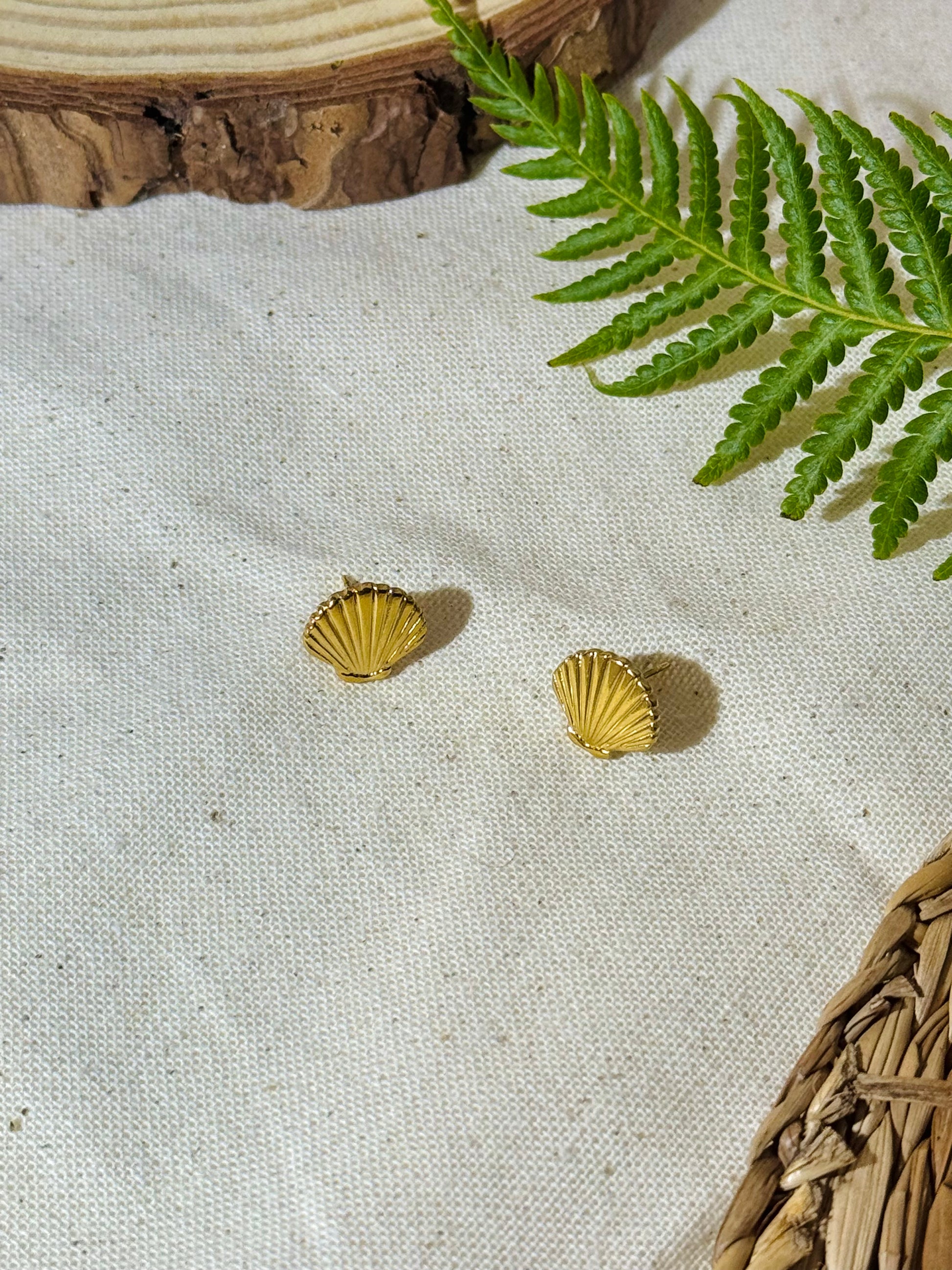 Boucles d’oreilles dorées en forme de coquillage éventail.