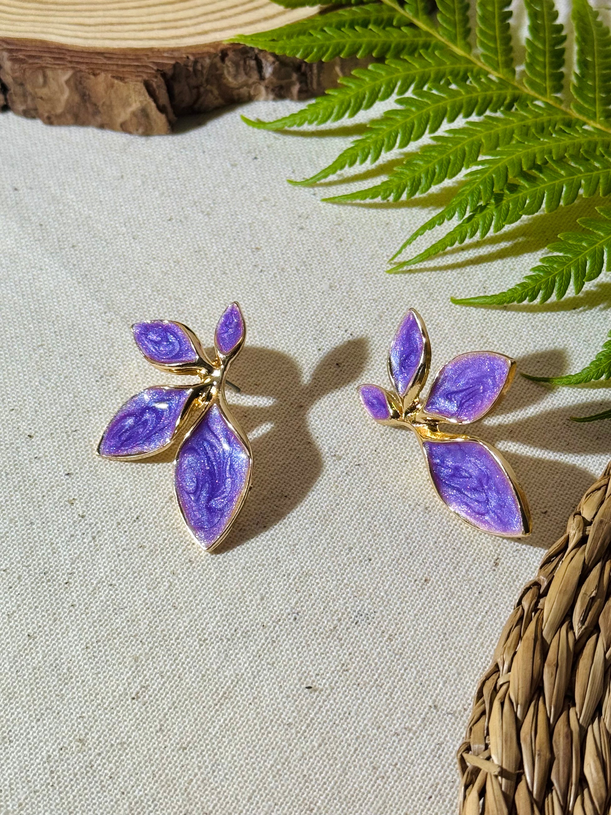 Boucles d’oreilles en forme de feuilles délicates, teintées d’un violet lumineux à effet marbré, sublimées par des contours dorés.