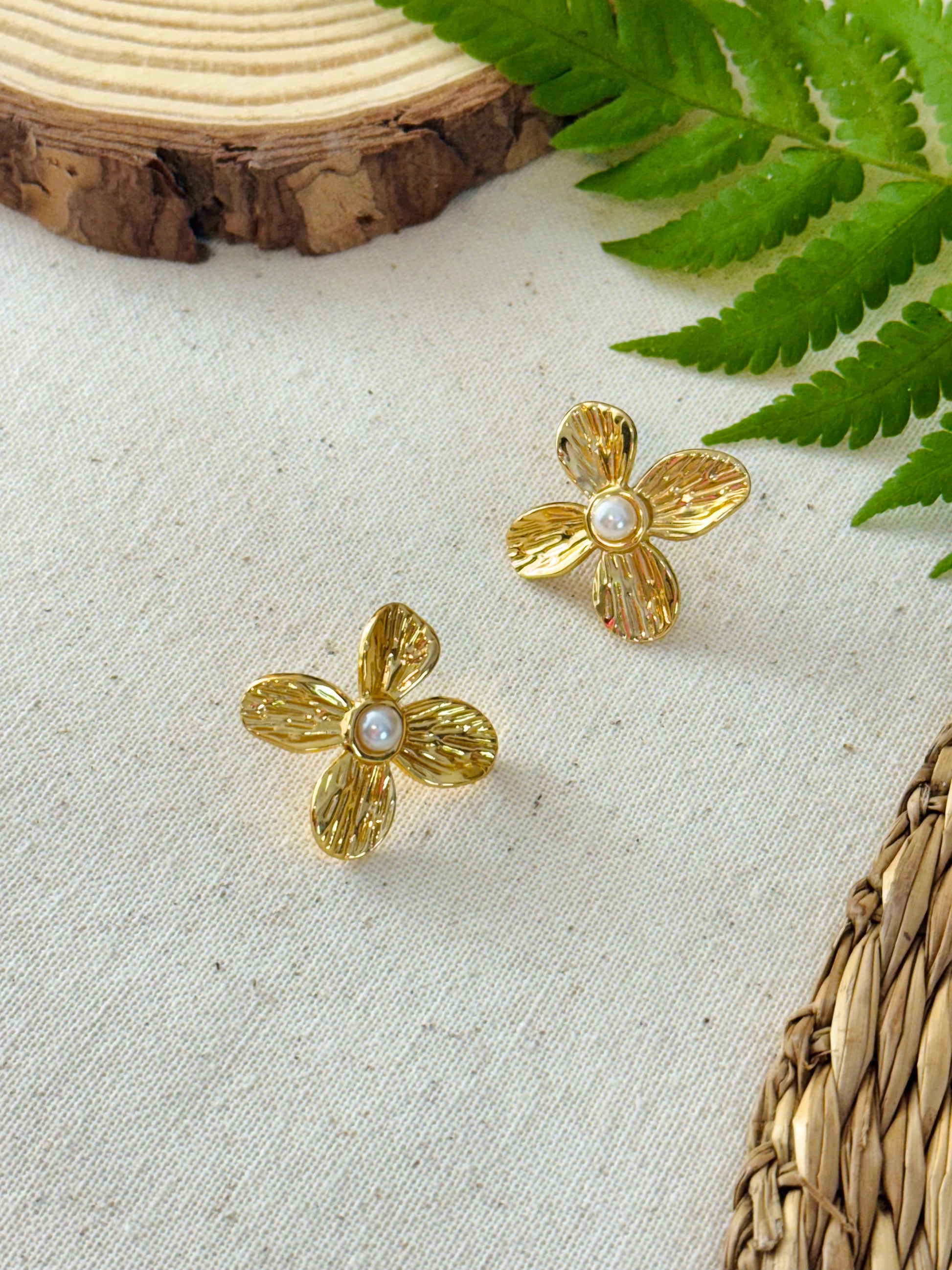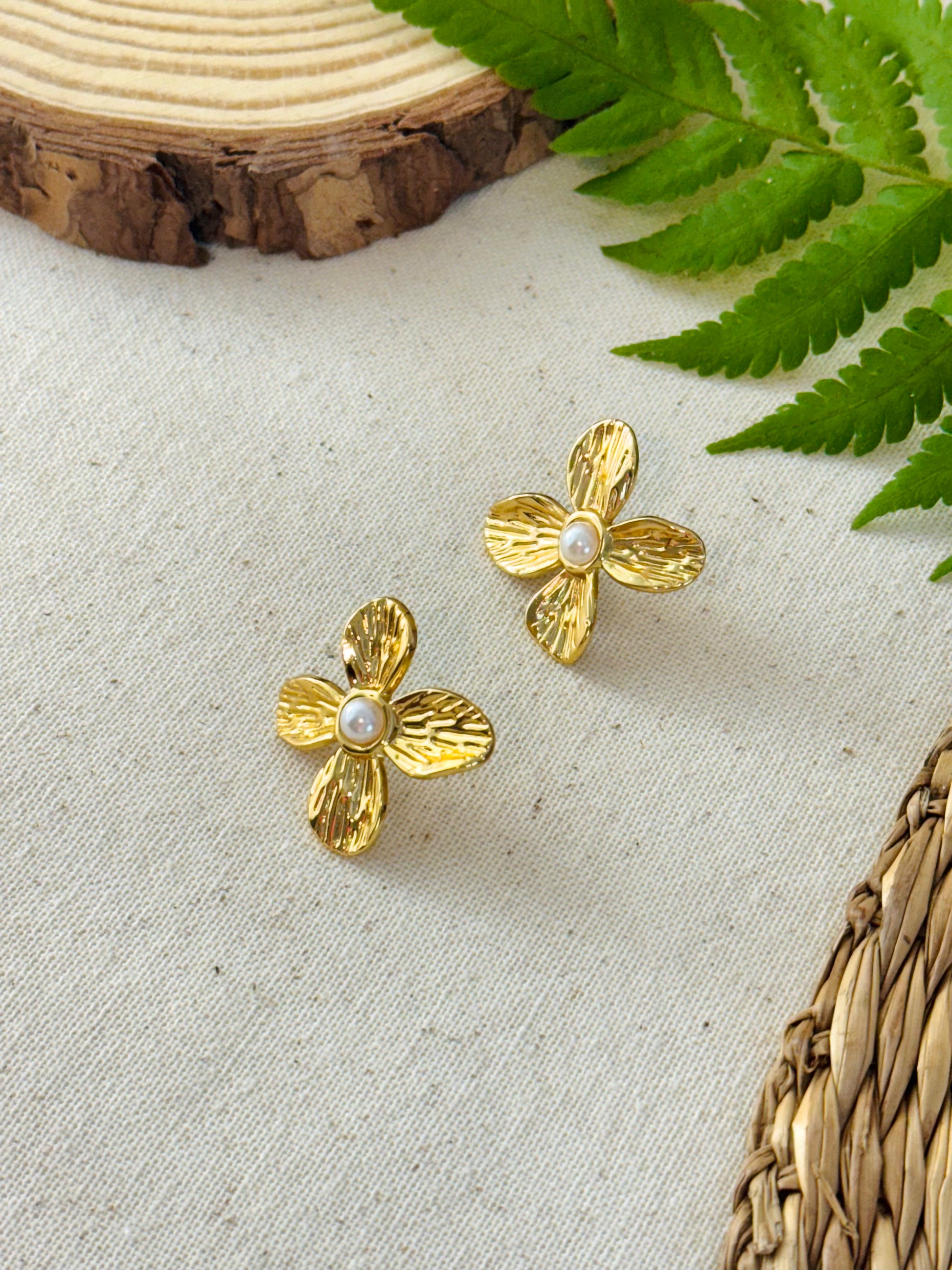 Boucles d’oreilles dorées en forme de fleur, avec perle au centre.